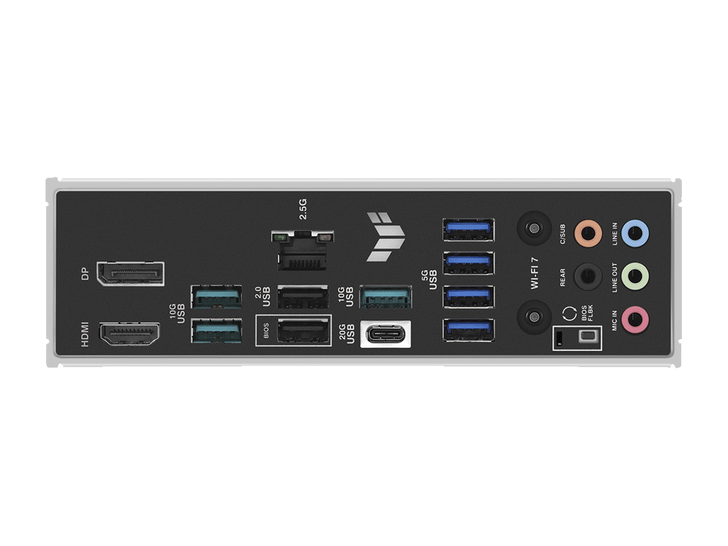 後部出入力ポート | 1 x USB 20Gbpsポート (1 x USB Type-C®) 3 x USB 10Gbpsポート(3 x Type-A) 4 x USB 5Gbpsポート(4 x Type-A) 2 x USB 2.0ポート(2 x Type-A) 1 x DisplayPort 1 x HDMI™ポート 1 x Wi-Fiモジュール 1 x Realtek 2.5Gbイーサネットポート 5 x オーディオジャック 1 x BIOS FlashBack™ボタン |